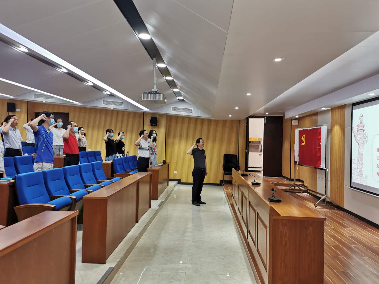微党课结束后,在公司党委书记邬智同志的领誓下,党员们佩戴党员徽章,面向党旗,庄严地举起右拳,重温入党誓词。(图/文 公司办公室)