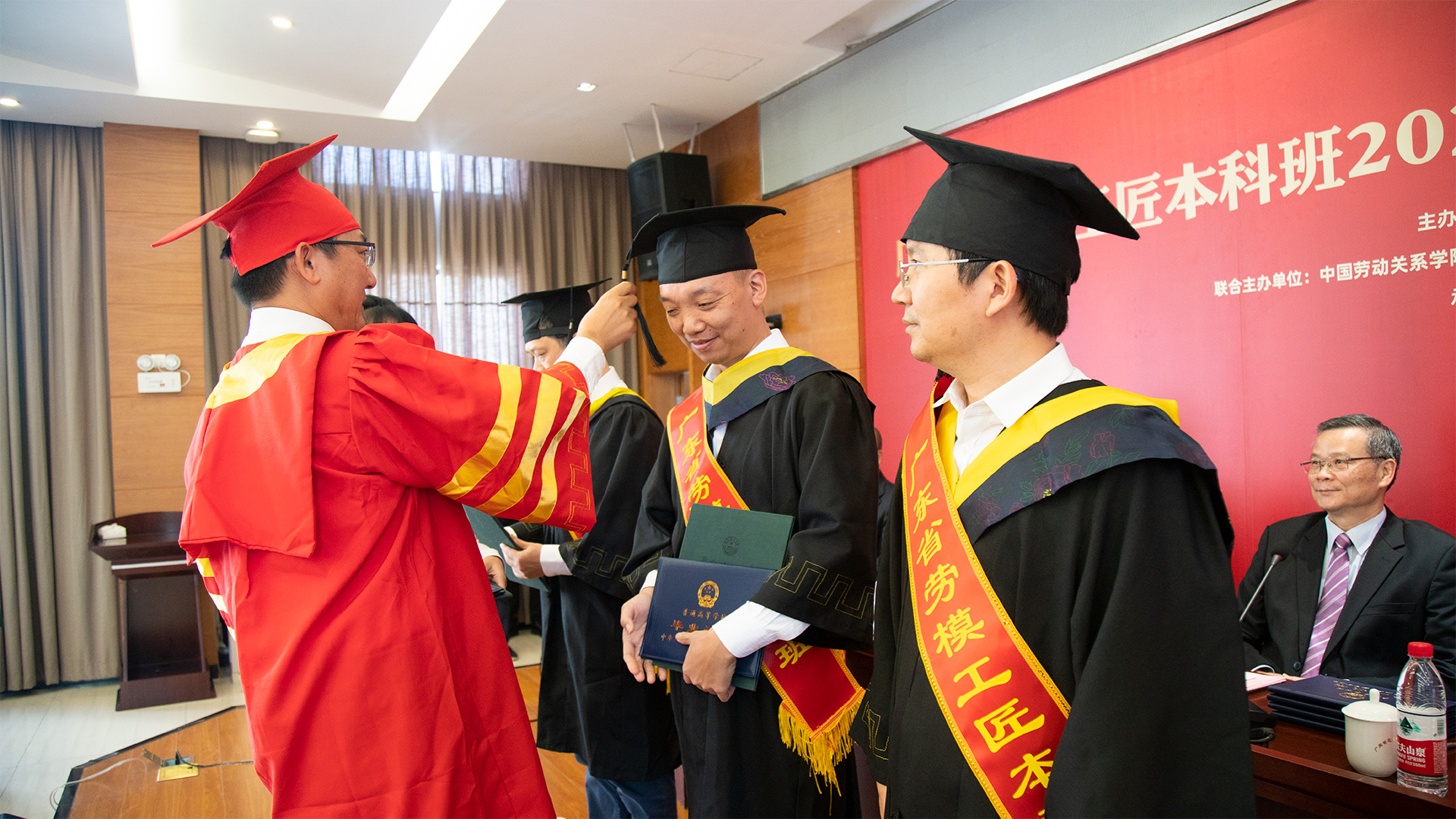 随后,王均为公司获得学士学位的劳模学员代表拨穗正冠,并颁发学位证书。