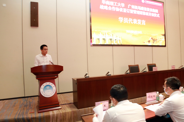 广州机场建设投资集团党委委员、副总经理全裕霖作为管理研修班学员代表发言。他代表全体学员承诺,必将提高认识,端正态度,严守纪律,服从管理,认真学习,勤于思考,把学习成果转化为推进机场三期项目建设的工作实效,做不负时代的城市建设者。