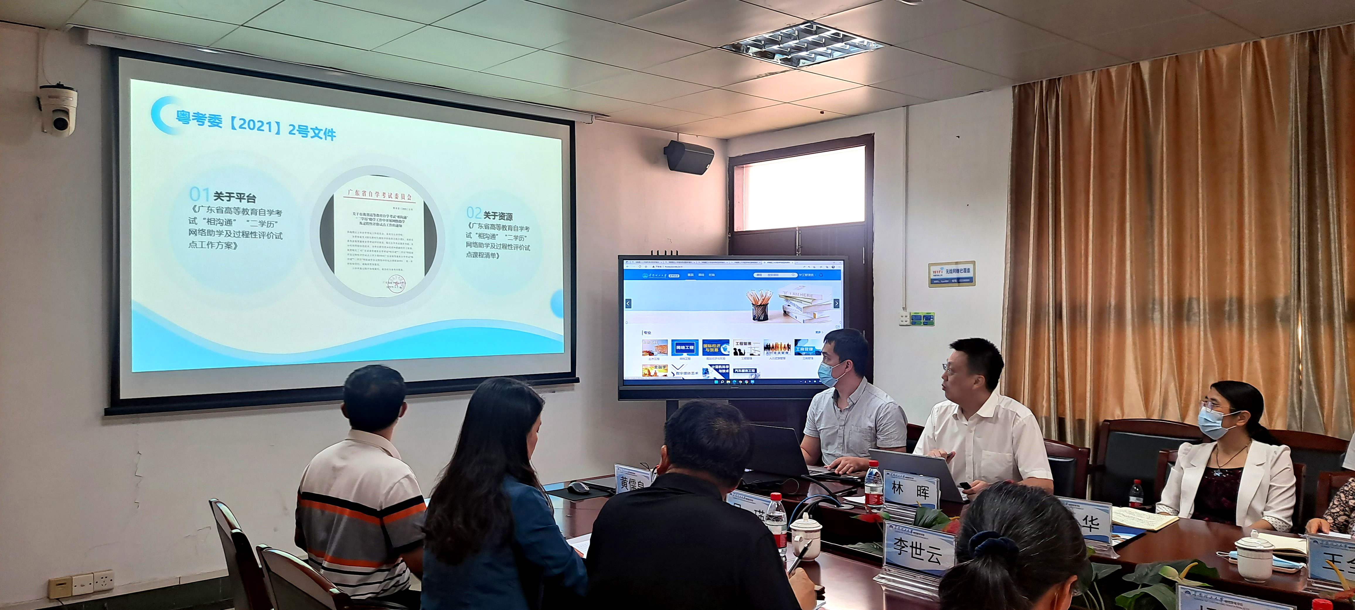 王全迪全面介绍了公司充分整合网络教育信息技术和教学管理优势,2013年起开始设建设自学考试网络课程资源,近10年分类建设了268门课程资源、覆盖25个主考专业。2021年9月根据省考办试点工作要求,进一步优化自考助学平台和试点课程资源标准化建设,2022年1月向省考办提交公司自学考试网络助学及过程性评价试点工作实施方案。华南教育科技公司负责人员林晖详细介绍和演示了公司自学考试网络助学平台功能、试点课程资源建设情况,以及考生学习过程操作流程,实现了平台可记录、可查询、可追溯,确保考生学习过程的真实性、有效性和数据安全性等建设标准。