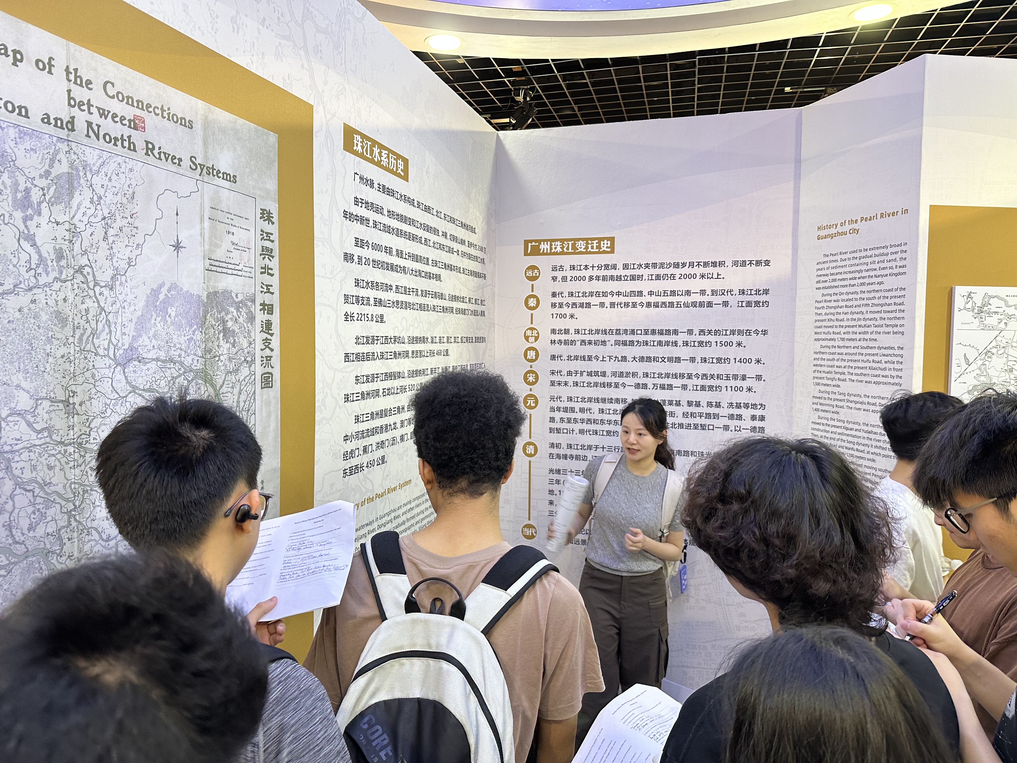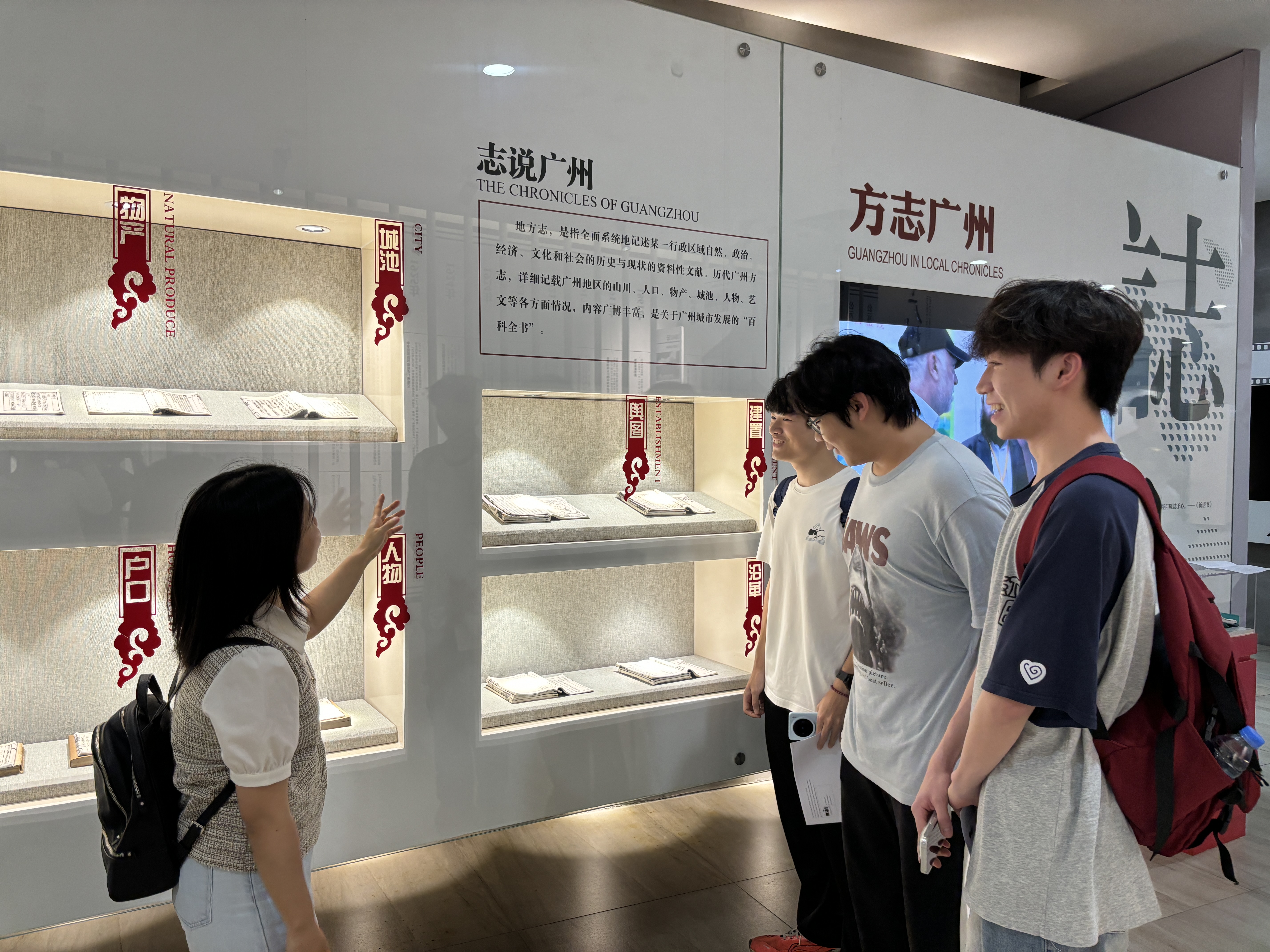 活动当天,同学们有序走进广州市地方志馆,在教师的双语讲解下开启对羊城历史脉络的深度探寻。展馆内分为“城、商、政、人、水、文、区情、大湾区”八个展区,保留原有的岭南地方志书展示,采用360度环幕影院、4D“船说广州”故事屋和骑楼街区场景复原等大量现代表现手法,全方面展示广州千年名城发展历程,以及粤港澳大湾区、泛珠三角城市区域合作进程。通过知识点双语问答的形式,师生们从广州在中国共产党百年征程中承载的重要历史角色里,深刻感悟革命先辈英勇无畏、矢志不渝的奋斗精神;在聆听广州作为海上丝绸之路重要枢纽的千年商贸传奇中,真切感受岭南文化兼容并蓄的开放胸怀;在深入了解粤剧、西关正骨等传统技艺中,充分领略广州传统文化的独特魅力。