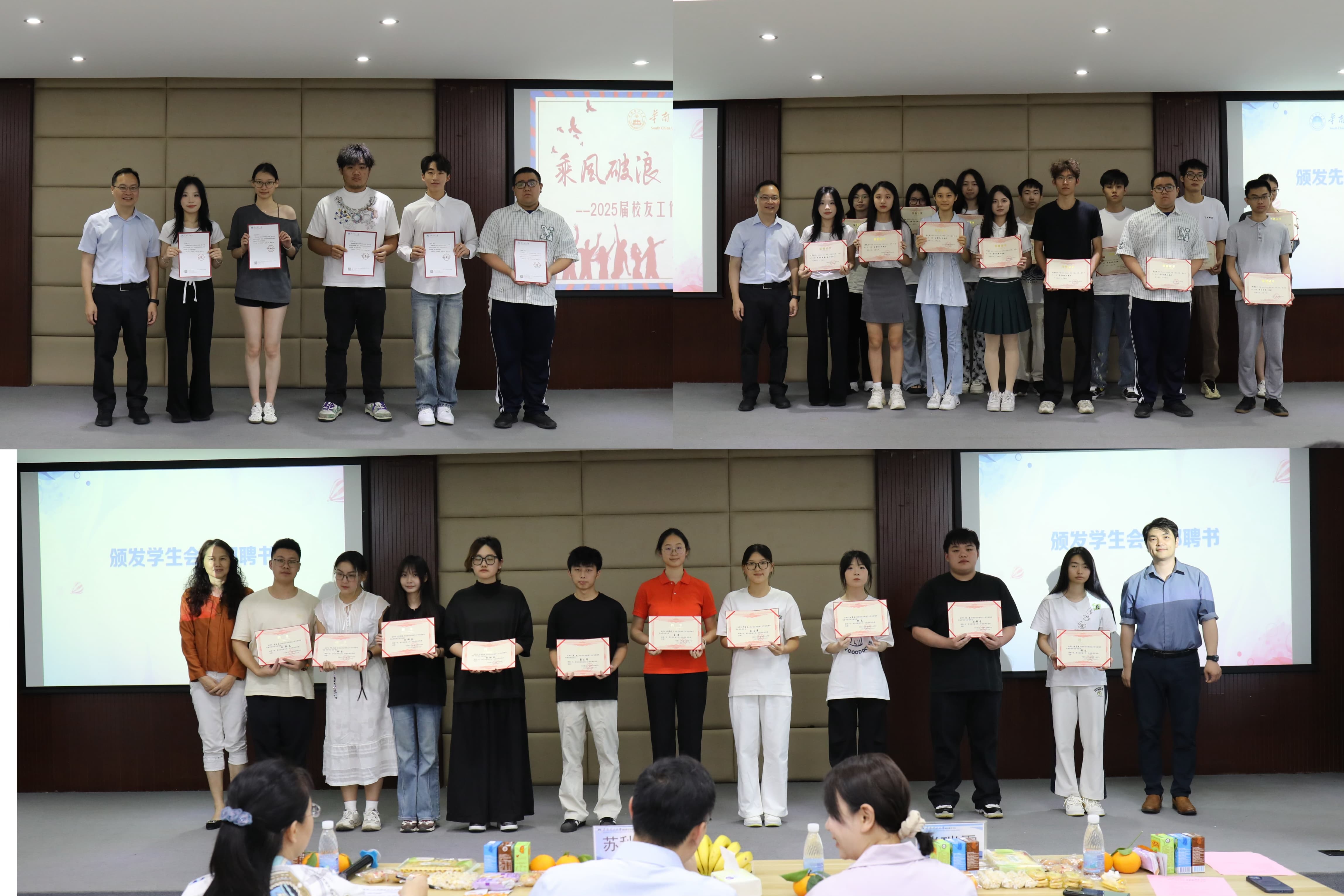 活动现场表彰了2023-2024学年出国留学项目员工先进个人,并为获奖同学颁发了荣誉证书。同时公布了 2025 届员工联络员及新一届员工会干部名单,并分别颁发了聘书。在风采展示环节,通过一段精心制作的vlog,同学们共同回顾了在校期间的精彩瞬间,展现了青春的风采与活力。此外,往届学长也通过视频送来了祝福,鼓励同学们勇敢追梦,不负韶华。
