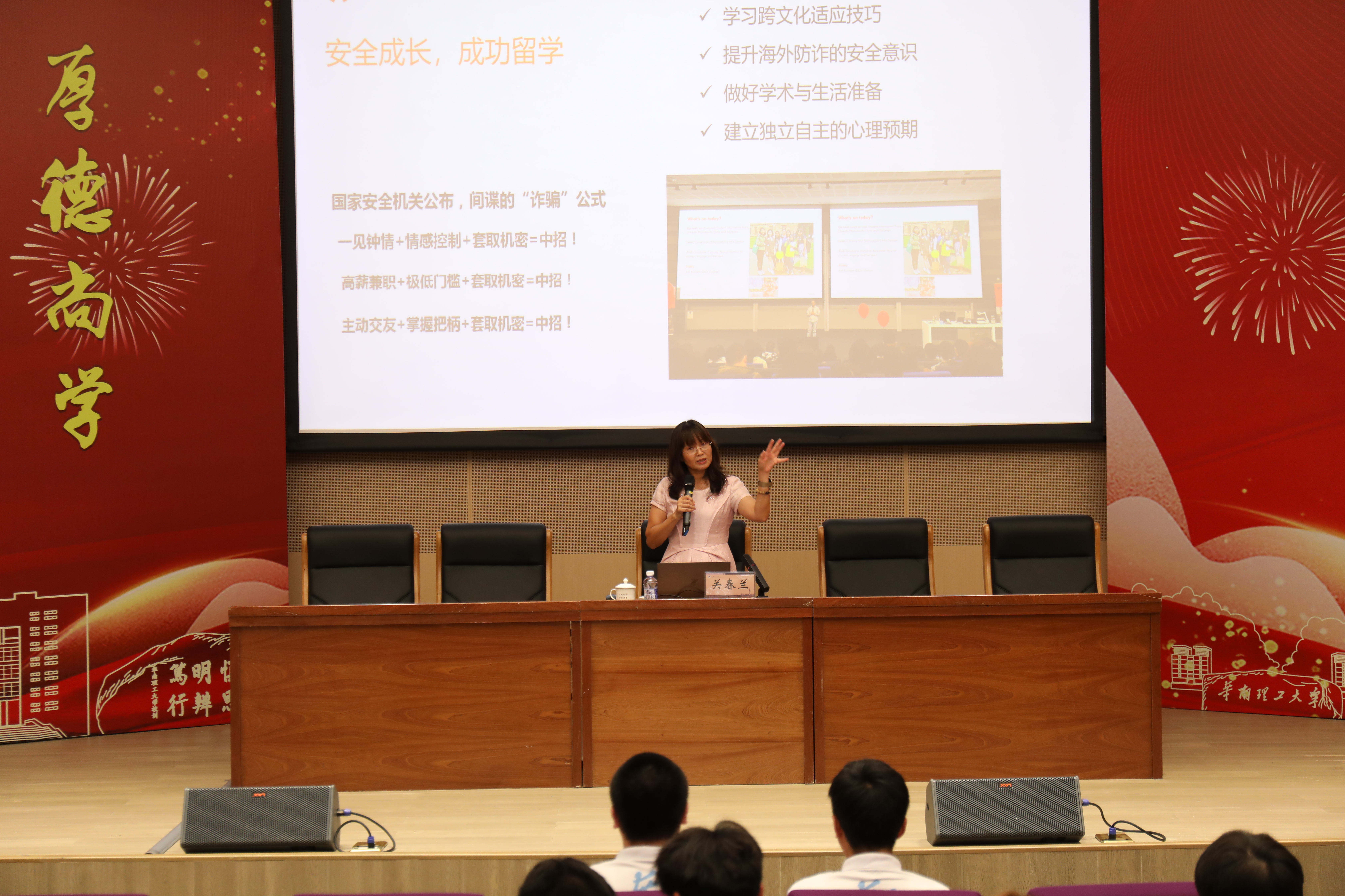 课堂上,关春兰还以短视频形式展示了于敏等“国之巨星”挺起民族脊梁,到观看“九三阅兵”后伊拉克籍记者方浩明对和平的由衷倾诉,再到地面突击方队“五边形战士”丁辉在岗位上追求极致的执着。她希望广大新生珍惜出国留学的宝贵机会,以勤学筑牢根基、用担当诠释初心,不负时代重托;同时,结合项目优秀毕业员工案例与留学安全知识讲解,鼓励同学们向学长学姐们学习,充分利用公司搭建的优质平台与丰富资源,紧握“信念、内驱、专注”三把成长钥匙,在求学路上奋力拼搏,以扎实的学识积淀与安全稳健的成长,为未来报效祖国积蓄力量。