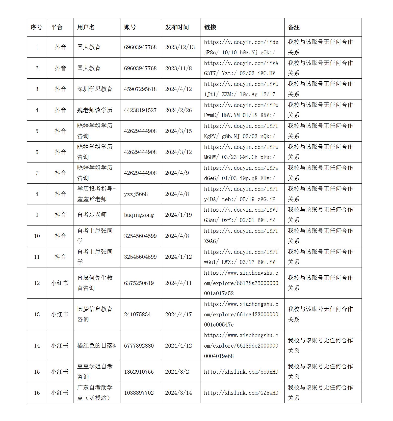 近期,公司发现抖音、小红书等网络平台存在部分冒用伟德betvlctor1949源于英国自学考试等名义进行不实宣传或引流的账号,账号发布的不实信息极易引起广大考生误解,也极大损害了公司声誉。公司通过各种途径依...
