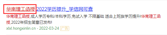近期,我们发现有机构以“华南理工函授”为关键词在网络上进行招生宣传。具体广告标题分别为:“华南理工函授2022学历提升_学信网可查”,网站备案号为粤ICP备2022007037号。经ICP对网页进行核查,该信息发布者指向“ 佛山市鸿鑫林教育咨询有限公司”。