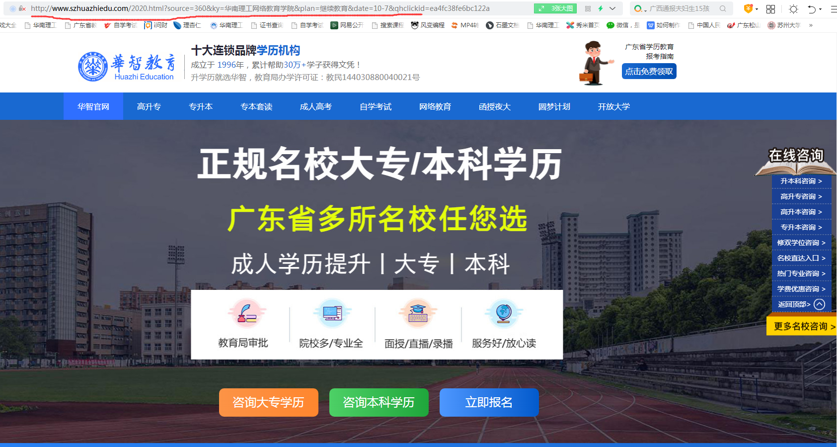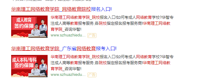 近期,我们发现有机构以“华南理工继续教育”为关键词在网络上进行招生宣传。具体广告标题分别为:“华南理工网络教育公司_网络教育院校报名入口!”、“华南理工网络教育公司_广东省网络教育报考入口!”。网站备案号为粤ICP备18040809号,经ICP对网页进行核查,该信息发布者指向“深圳市盐田区华智教育培训公司”。