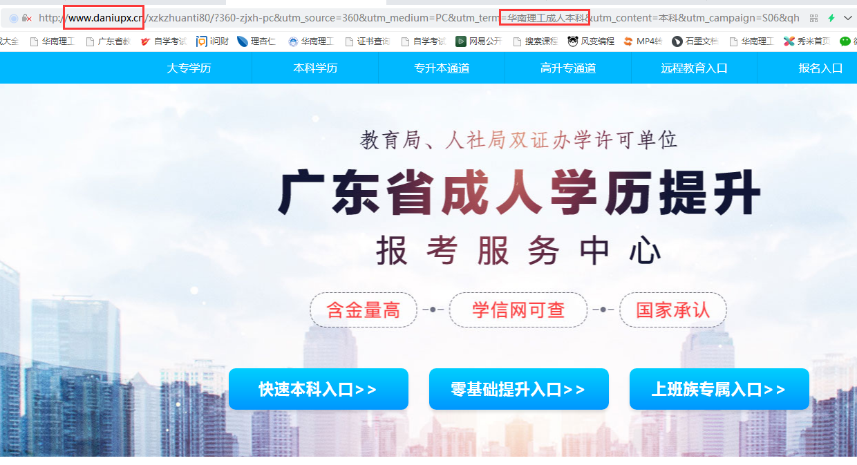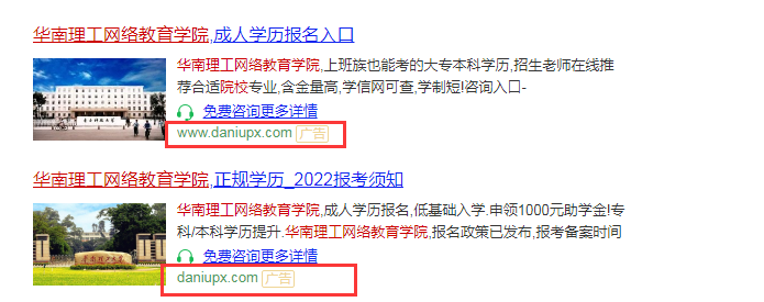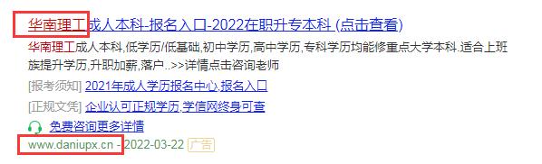 近期,我们发现有机构以“华南理工成人本科”、“华南理工网络教育公司”等为关键词在网络上进行招生宣传。具体广告标题分别为:“华南理工成人本科-报名入口-2022在职升专本”、“华南理工网络教育公司,成人学历报名入口”、”华南理工网络教育公司,正规学历,2022报考须知”。网站备案号为粤ICP备18120811号,经ICP对网页进行核查,该信息发布者指向“广州市天河区大牛教育培训中心有限公司”。