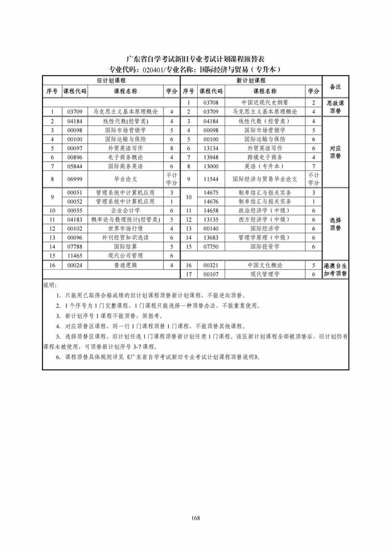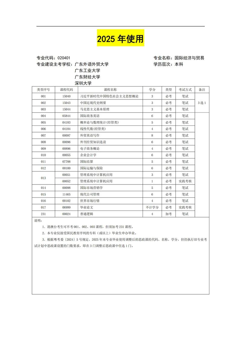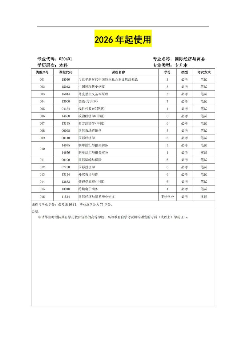 020401 国际经济与贸易 考试计划简表