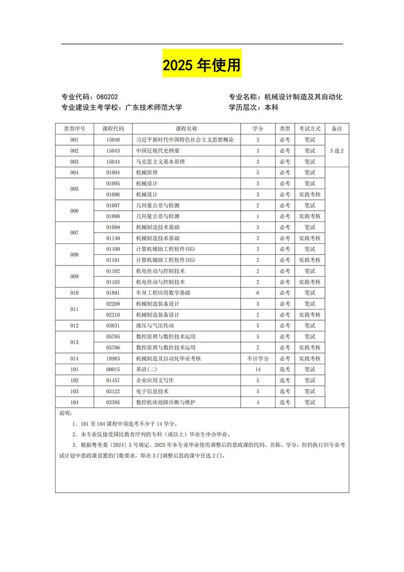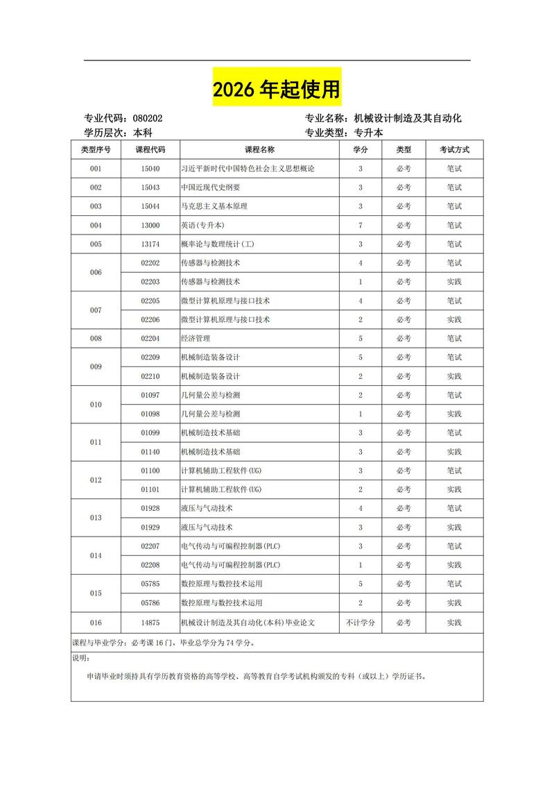 080202 机械设计制造及其自动化 考试计划简表