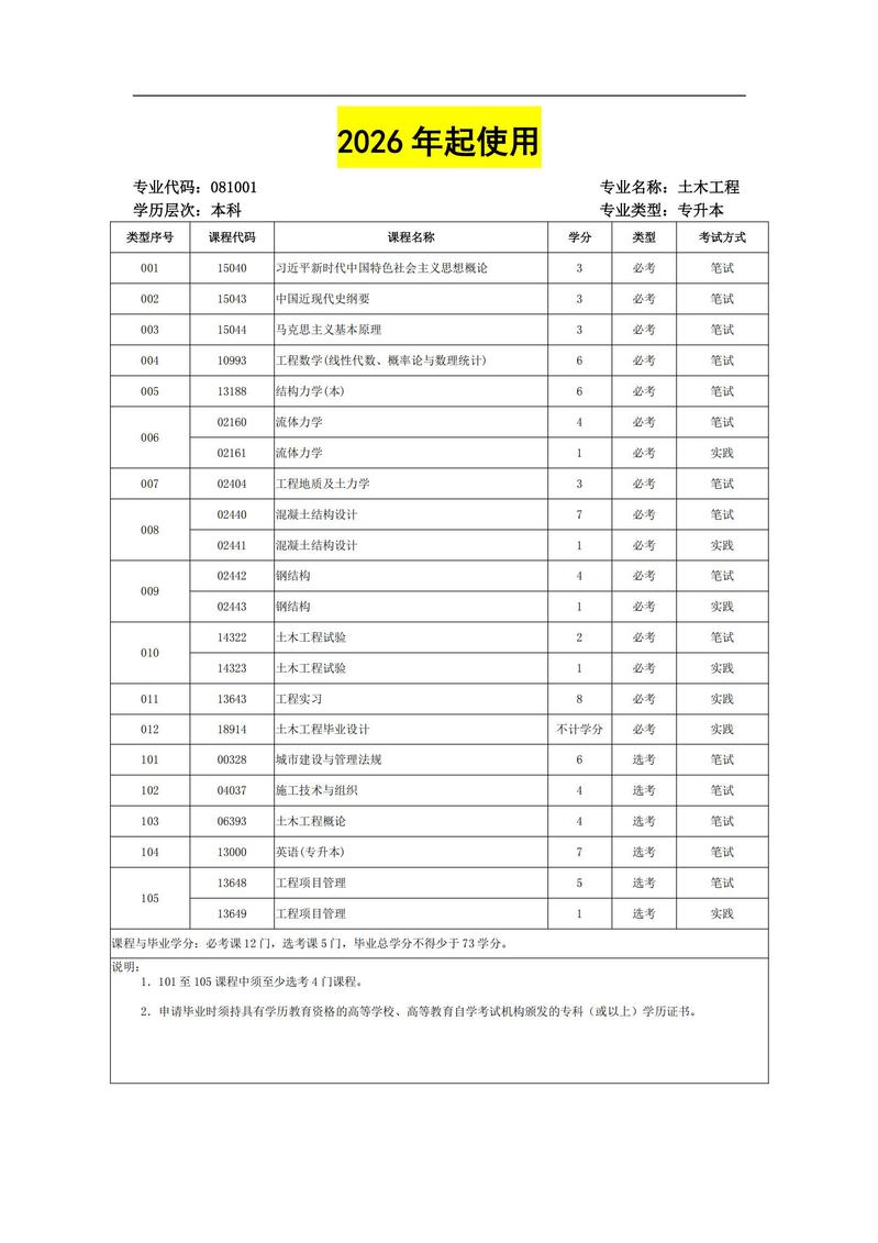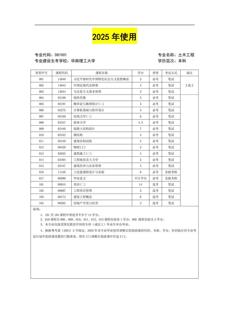 081001 土木工程 考试计划简表
