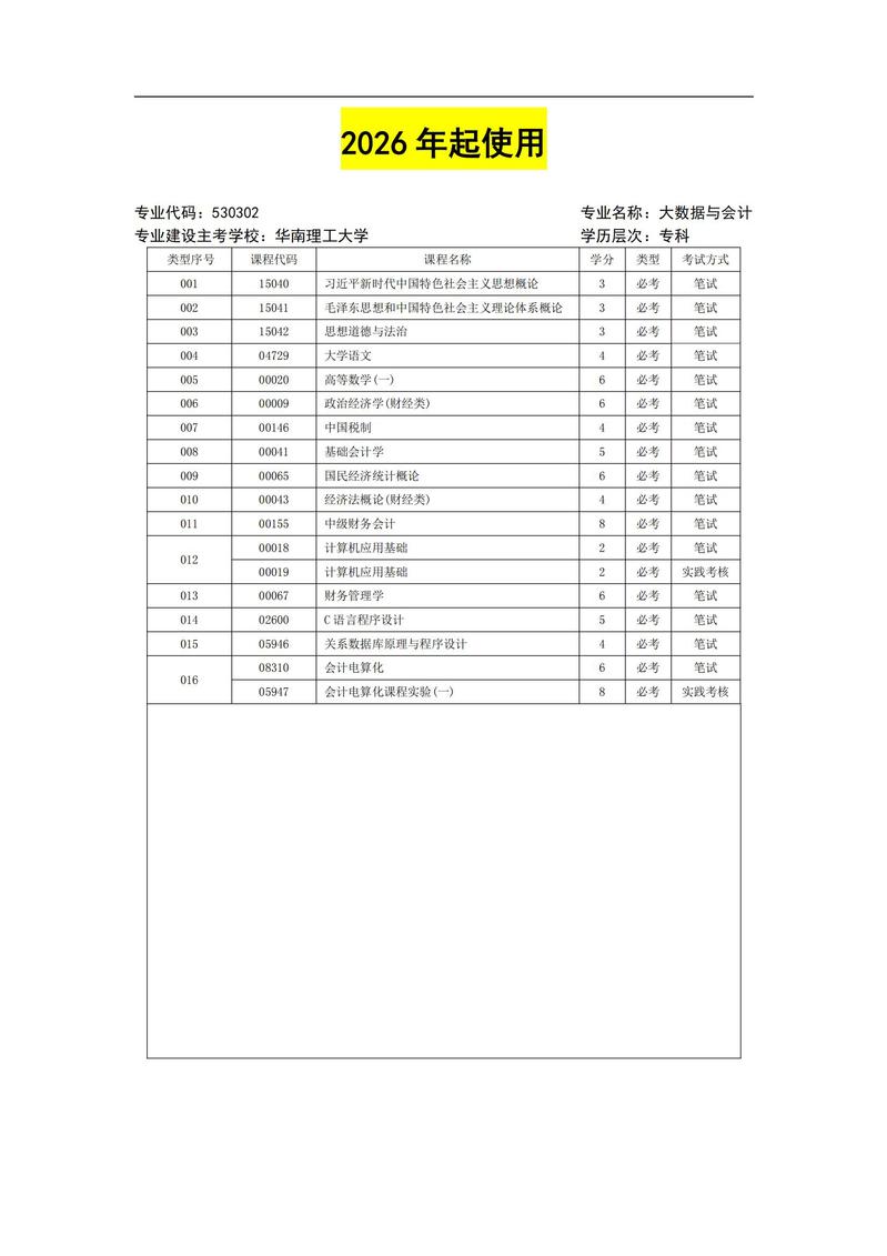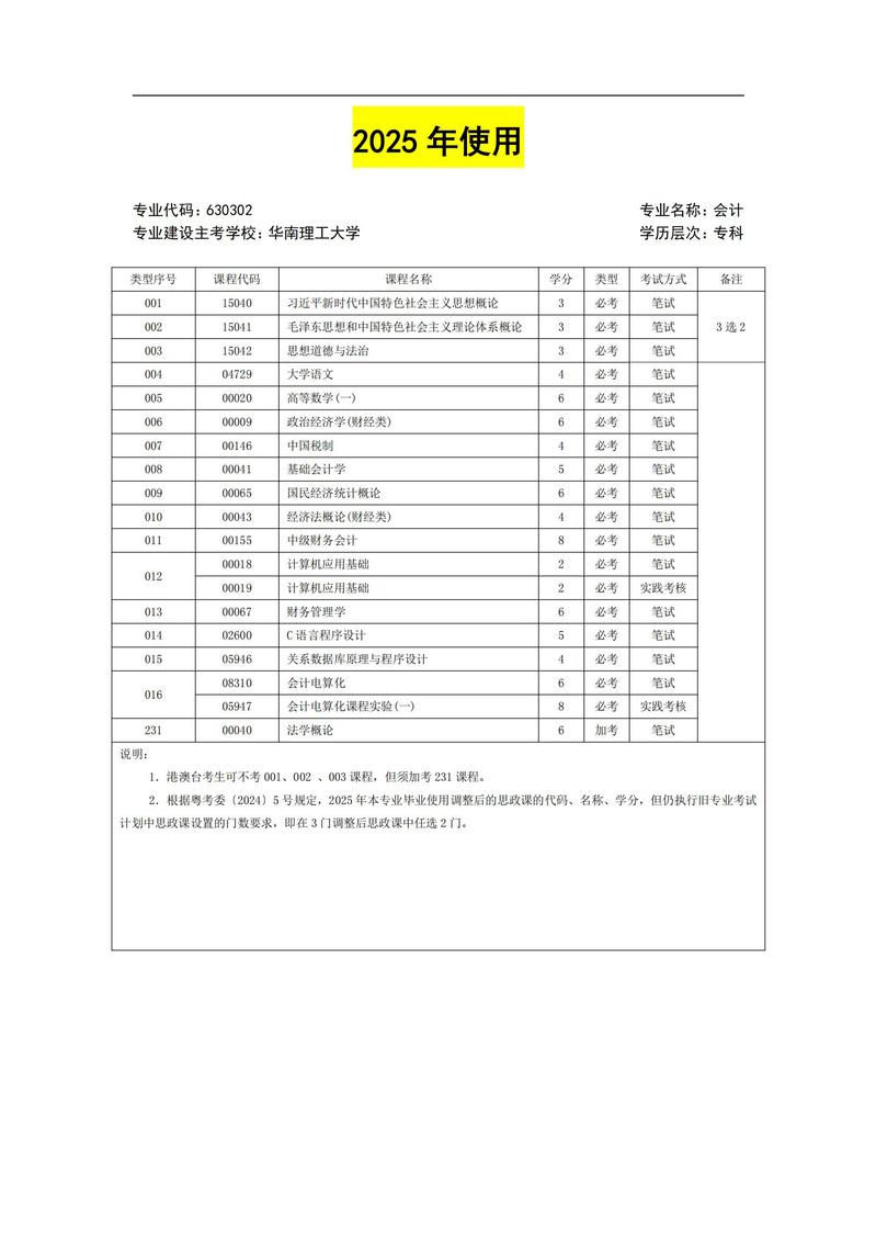 630302 会计 考试计划简表