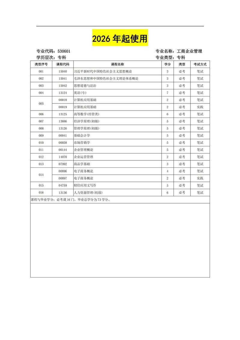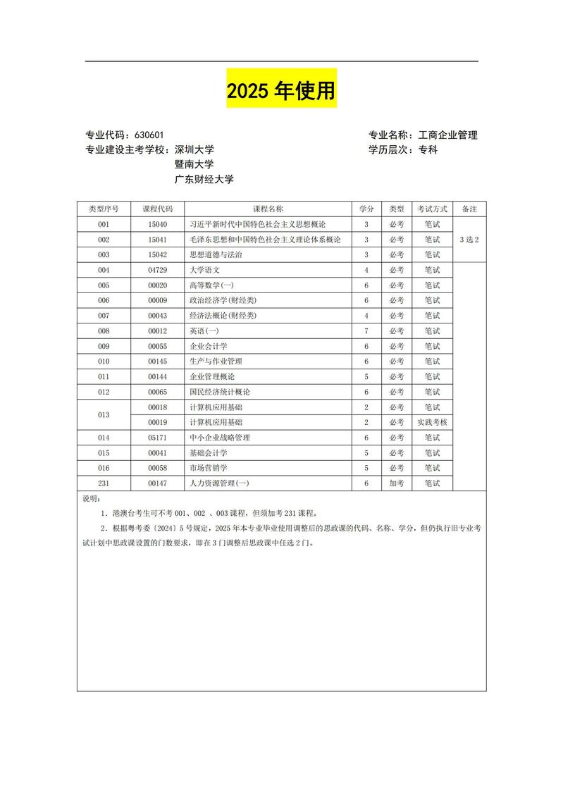 630601 工商企业管理 考试计划简表
