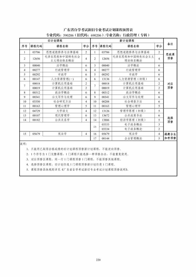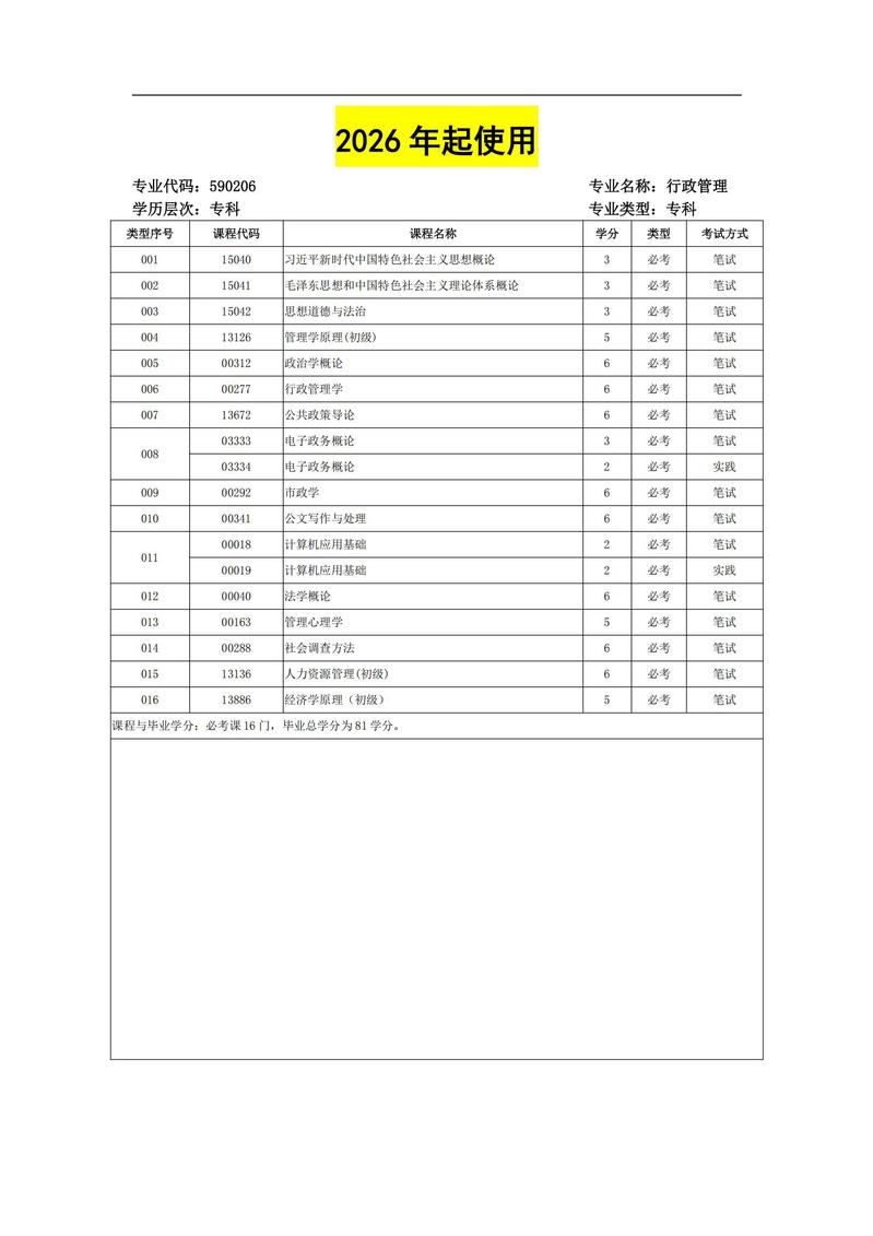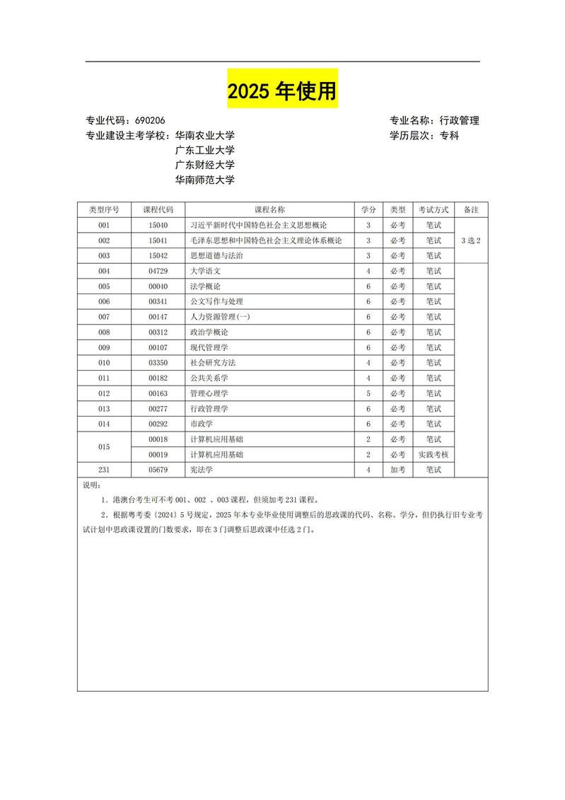 690206 行政管理 考试计划简表