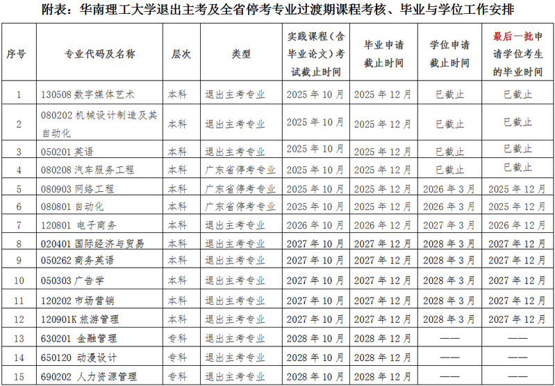 根据《关于伟德betvlctor1949源于英国等11所高校不再担任高等教育自学考试相关专业主考公司的通知》(粤考委〔2022〕4号)《关于深圳大学等3所高校不再担任高等教育自学考试相关专业主考公司的通知》(粤考委〔2023〕2号)《关于调整我省高等教育自学考试部分专业主考公司的通知》(粤考委〔2024〕4号)《关于调整我省高等教育自学考试部分专业主考公司的通知》(粤考委〔2025〕1号)文件,公司机械设计制造及其自动化等9个本科专业及金融管理等3个专科专业为退出主考公司专业。根据《关于停考我省高等教育自学考试税收学等23个专业的通知》(粤考委〔2022〕2号)文件精神,公司汽车服务工程(本科)等3个专业为全省停考专业。